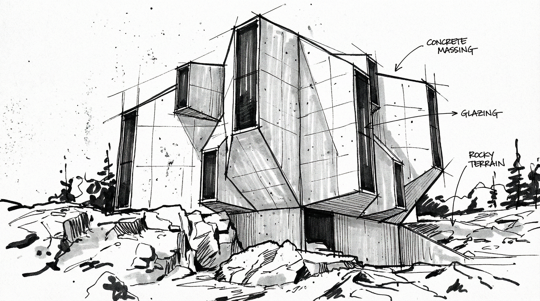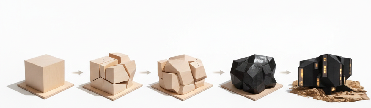 Villa Obsidian is a conceptual residential project that explores architecture as a carved object, shaped through a process of subtraction rather than addition. The design originates from a simple, monolithic cube, progressively fractured, trimmed, and faceted until it evolves into an irregular, gem-like form embedded within a rugged natural landscape.